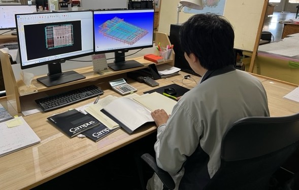 設計図をもとに、鉄骨の骨組みやその他も材料の数量を拾いだし、必要な鉄骨重量を算出し、鋼材の種類、単価などを確認して見積書も作成を行う。