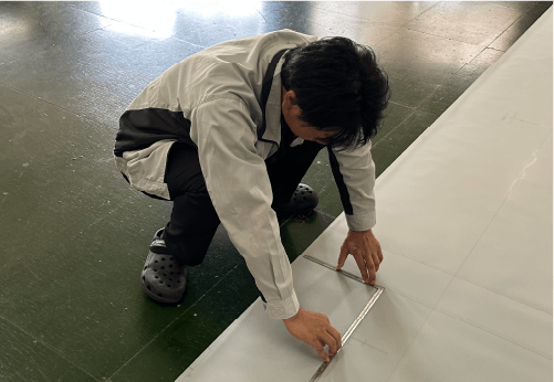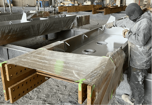 製品の防錆、耐火を目的とした塗装を施す。設計指示により、塗装種類・範囲・膜厚が設定されている。また、建物の外周に設置されるバルコニー製品などはめっき業者による溶融亜鉛めっき加工が必要となる。塗装後は膜厚検査を実施する。