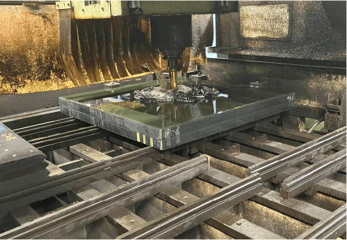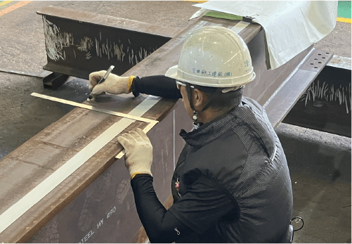 図面から出力した一次加工用のフィルムをもとに、納入した鋼材に対してマーキング、孔あけ、切断、開先加工、ショットブラストによる表面処理を行う。